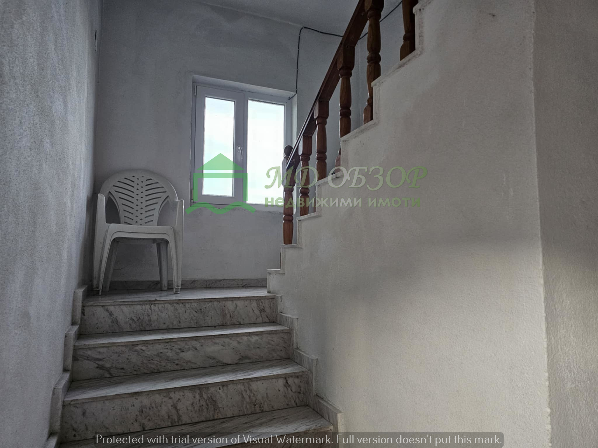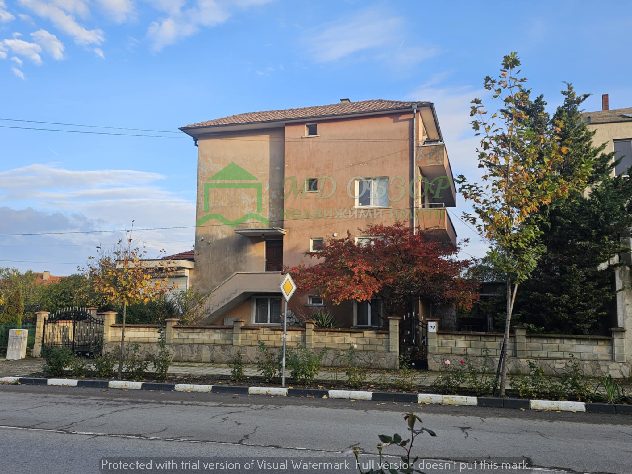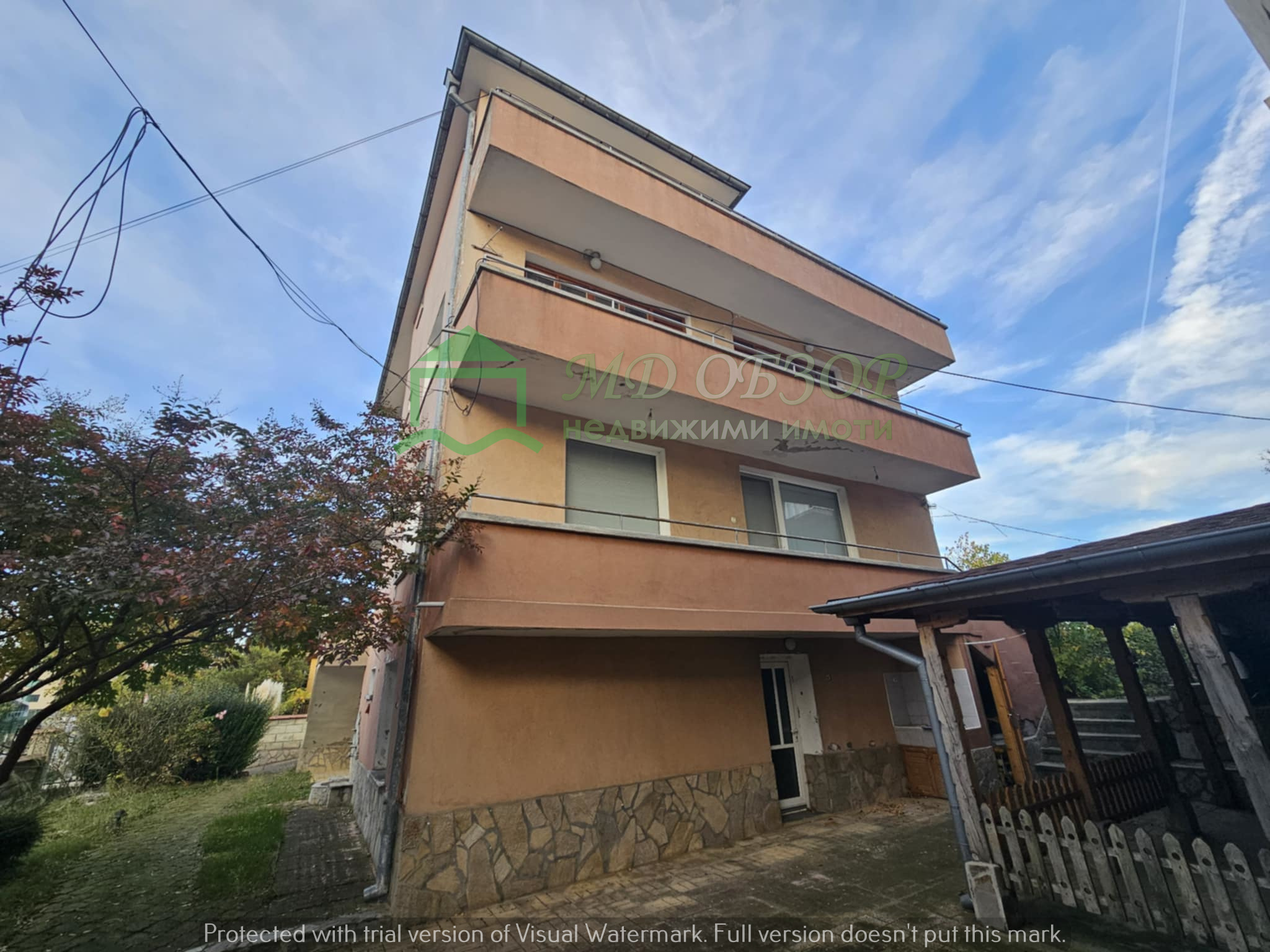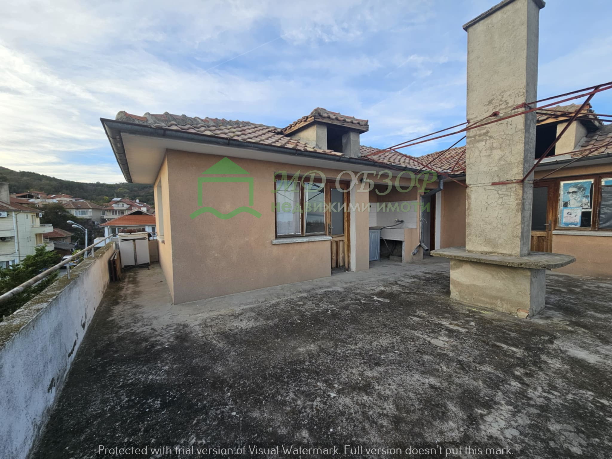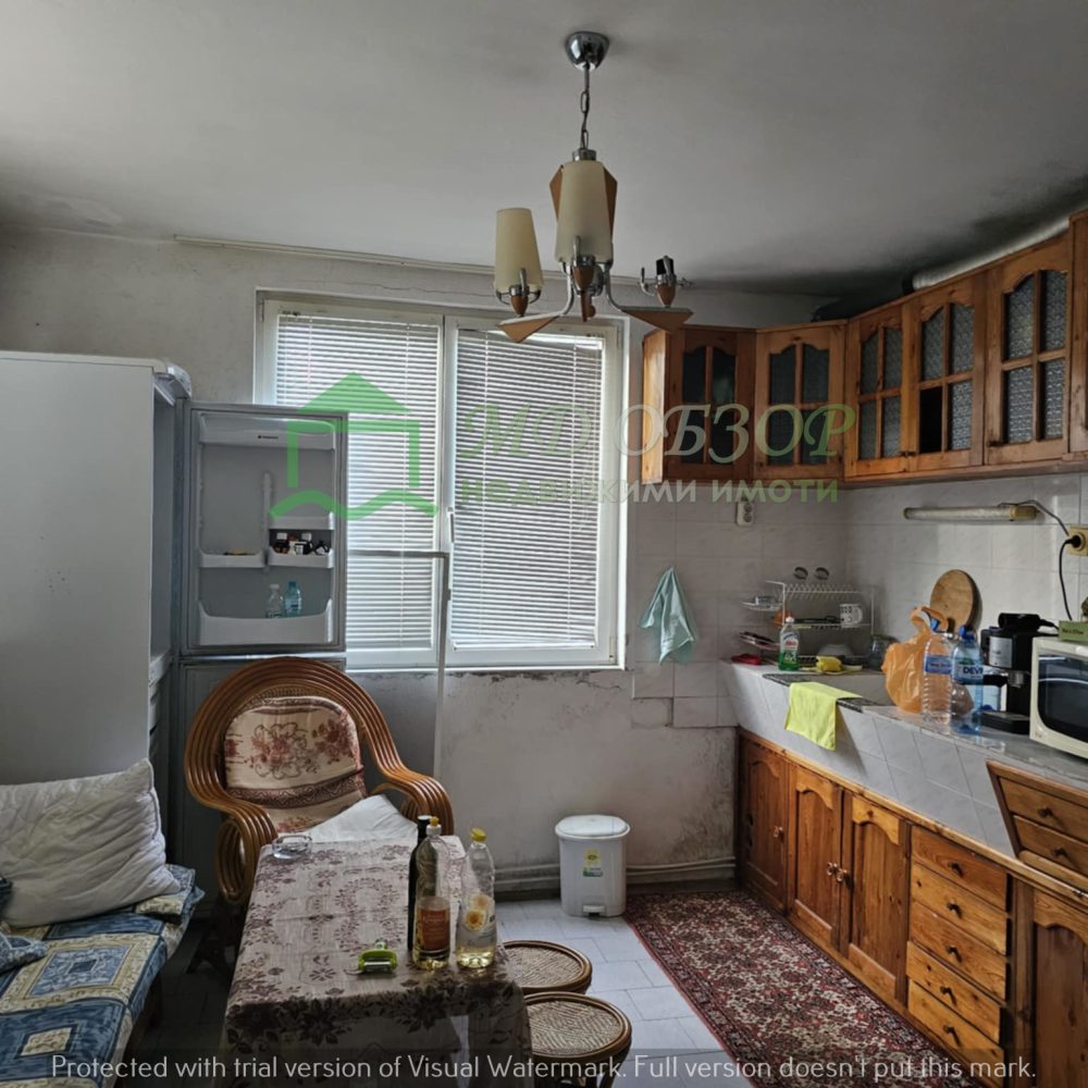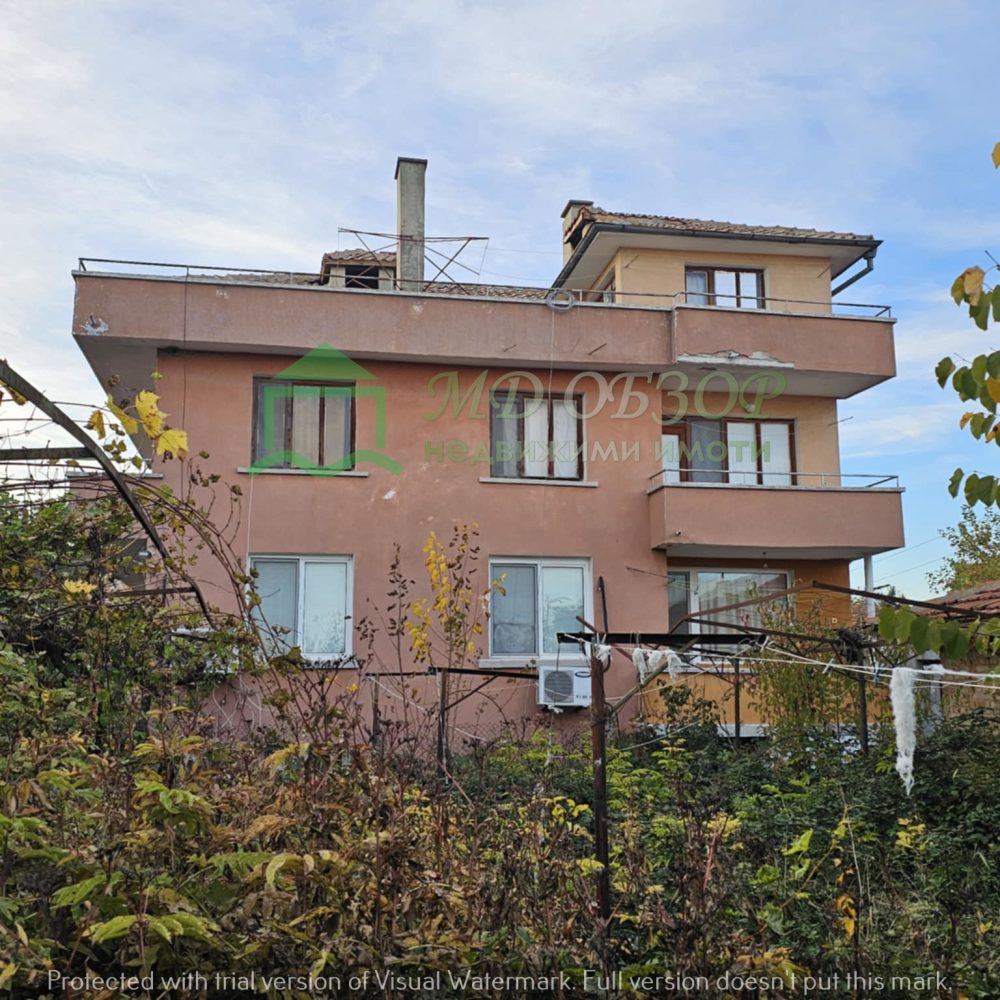 !!! Покрива на сградата е изпълнен с дървена конструкция и керемиди. Към момента няма течове от него. Плоския покрив също е в добро състояние. Стълбищната клетка между първи, втори и трети етаж е в добро състояние, като стъпалата са изпълнени с мрамор. Оградата пред входа на къщата е изпълнена от декоративно ковано желязо, гаражна врата и вход. Всеки от етажите е с отделно отчитане на електроенергията. Сградата се нуждае от текущ ремонт: частична подмяна на дограма, настилки по избор, евентуална външна изолация /в момента е с варо – циментова мазилка/, ремонт на санитарните възли.