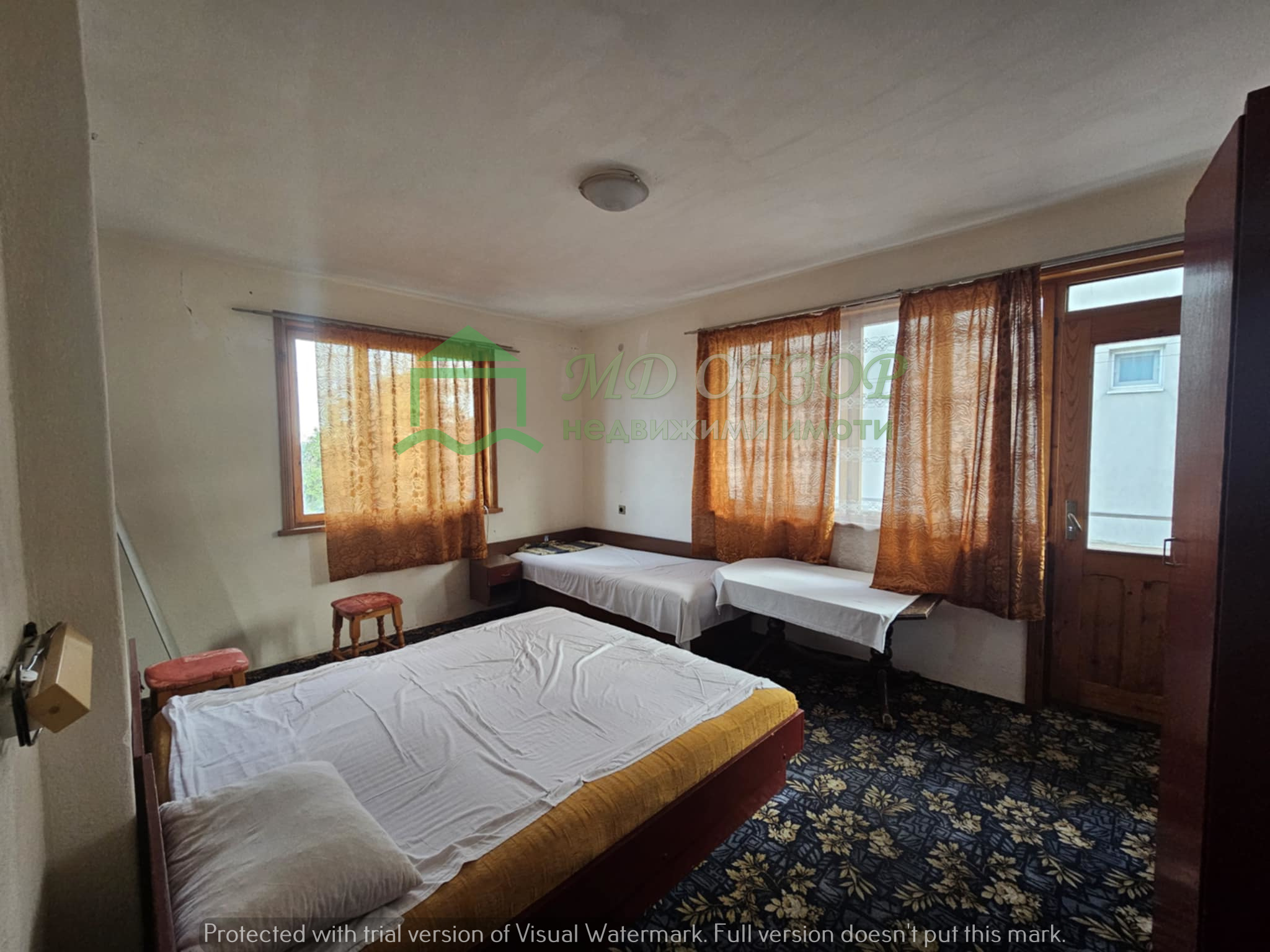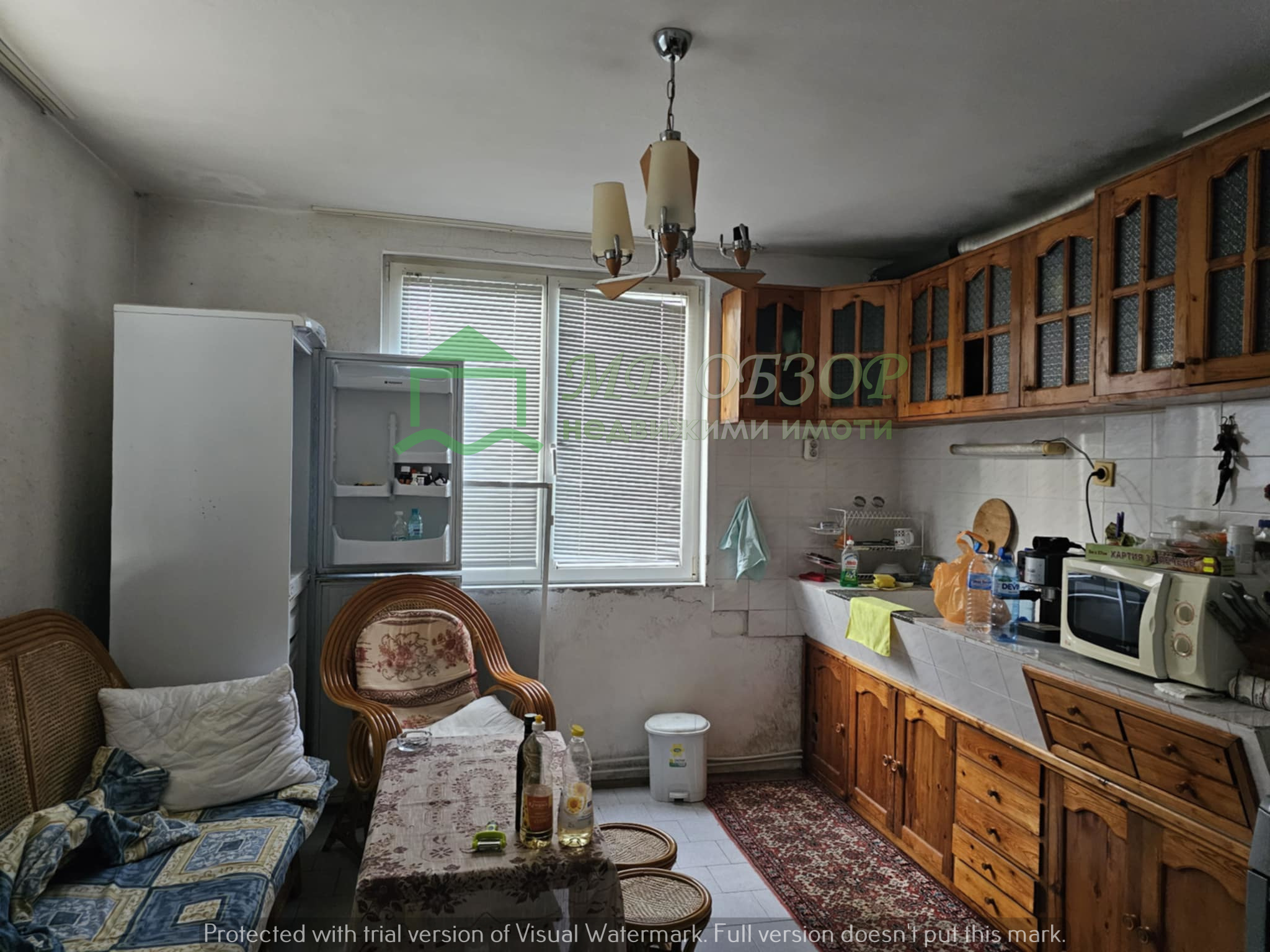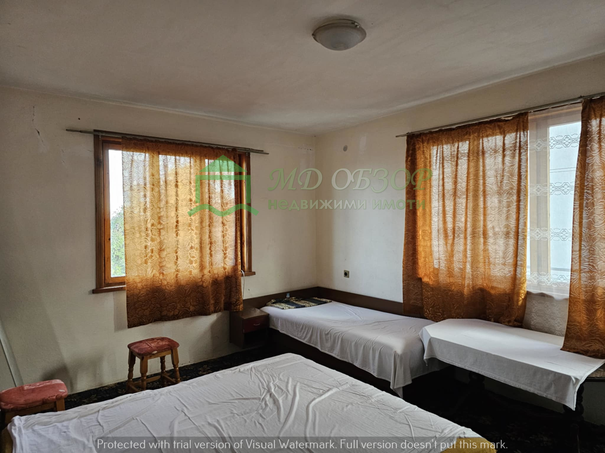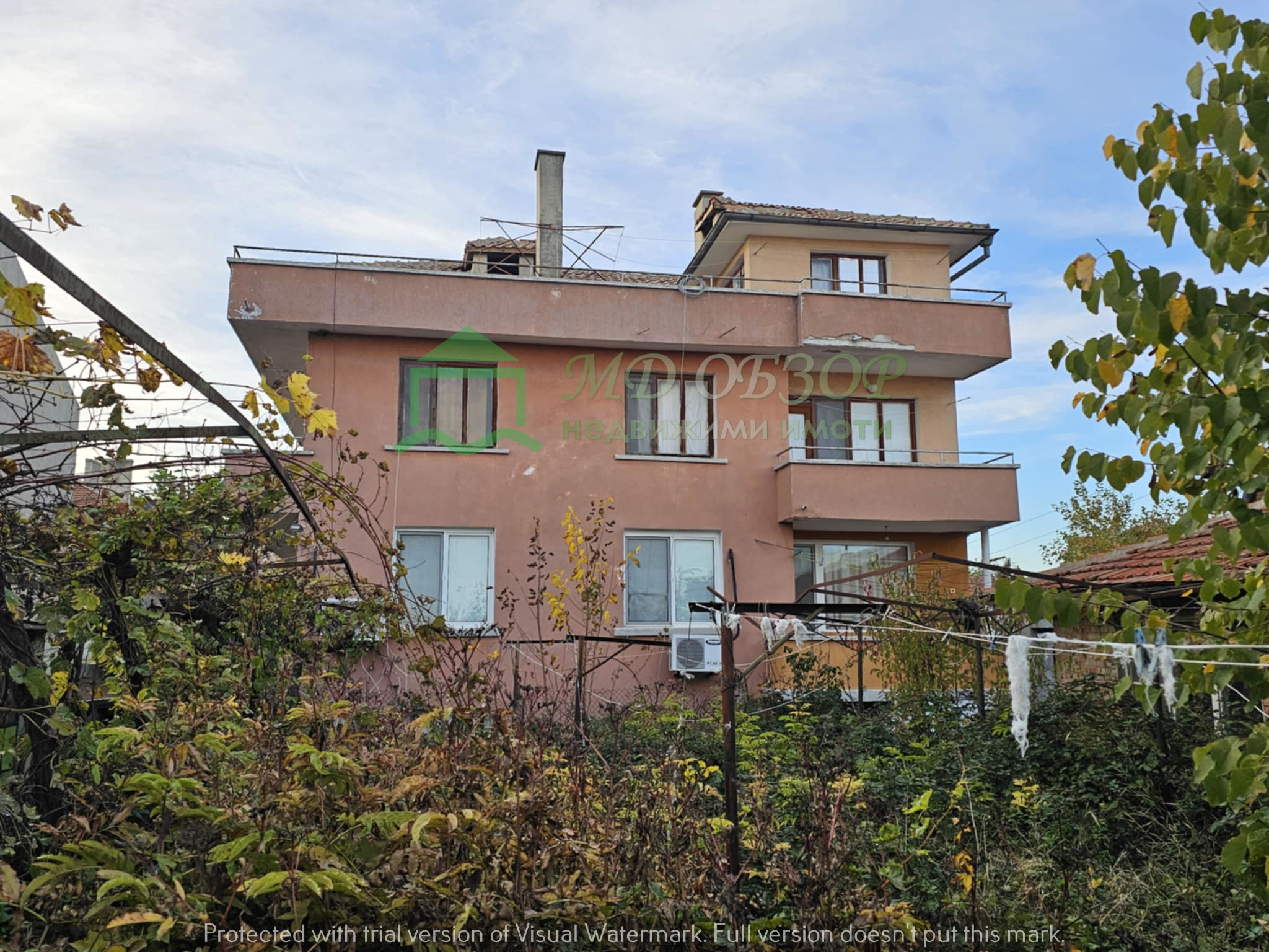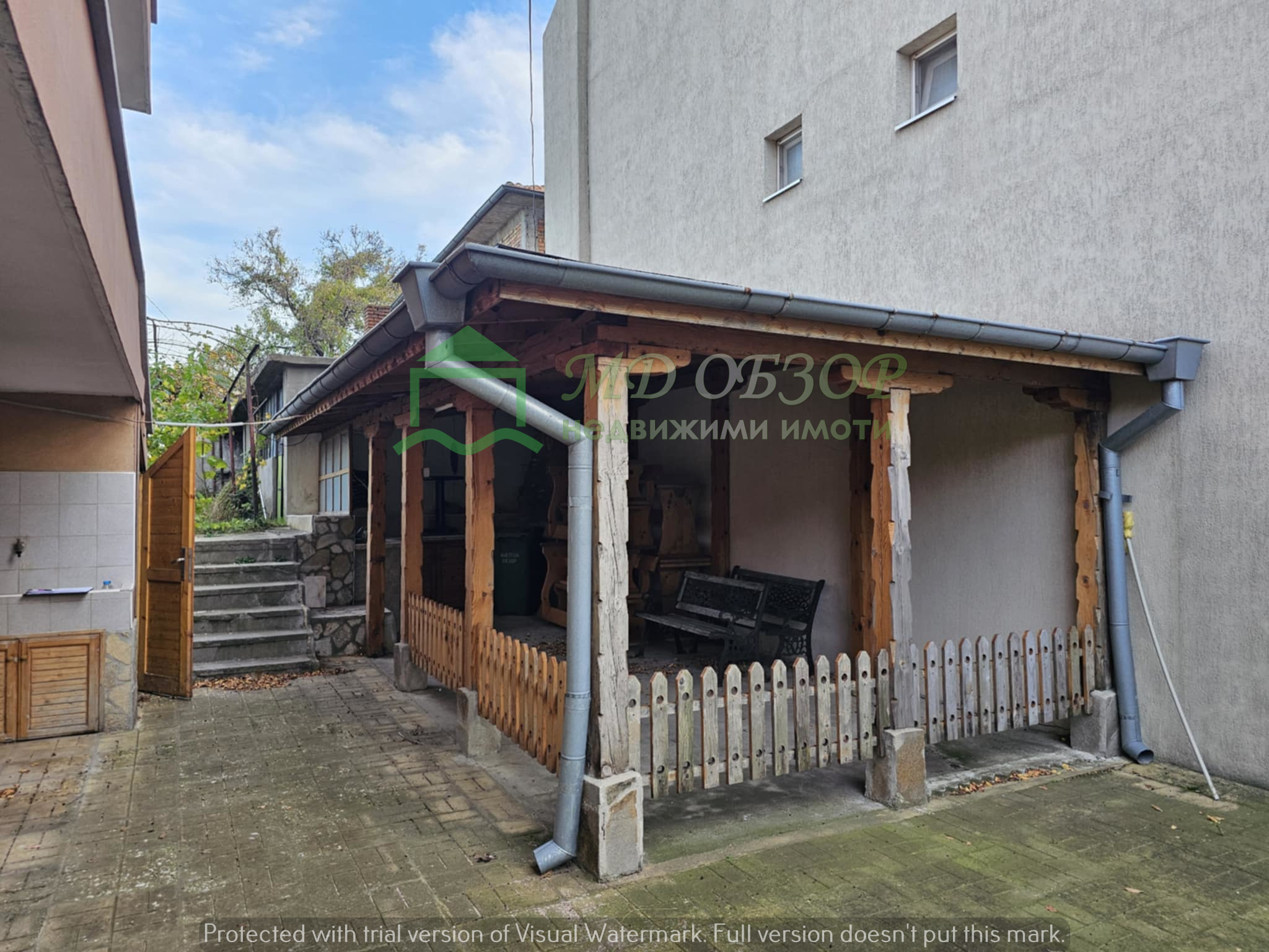!!! Покрива на сградата е изпълнен с дървена конструкция и керемиди. Към момента няма течове от него. Плоския покрив също е в добро състояние. Стълбищната клетка между първи, втори и трети етаж е в добро състояние, като стъпалата са изпълнени с мрамор. Оградата пред входа на къщата е изпълнена от декоративно ковано желязо, гаражна врата и вход. Всеки от етажите е с отделно отчитане на електроенергията. Сградата се нуждае от текущ ремонт: частична подмяна на дограма, настилки по избор, евентуална външна изолация /в момента е с варо – циментова мазилка/, ремонт на санитарните възли.
