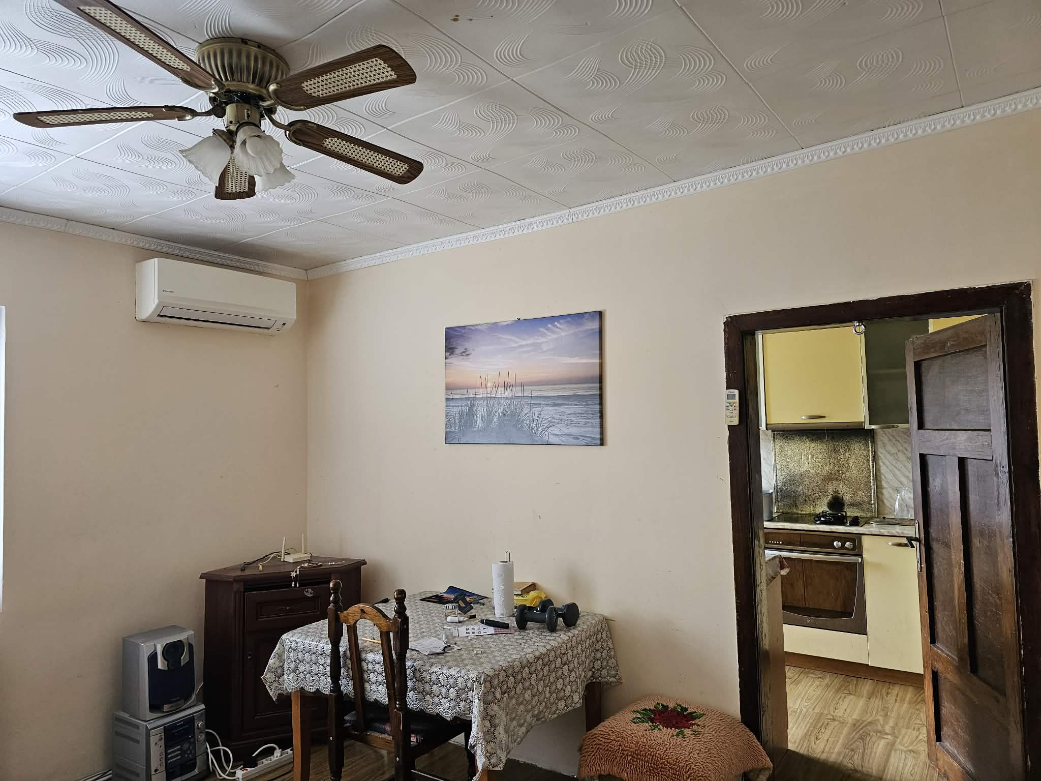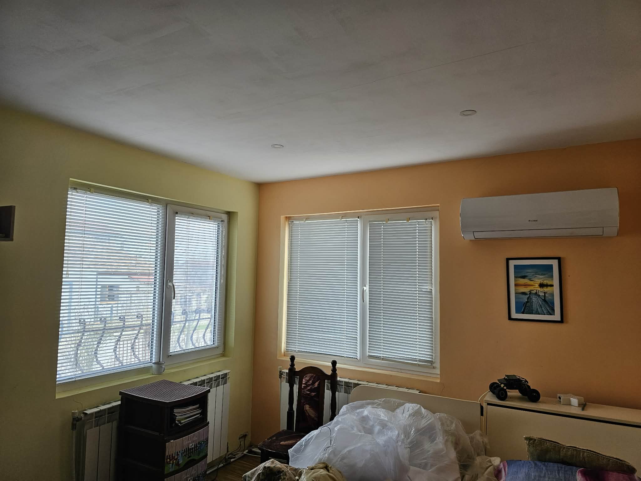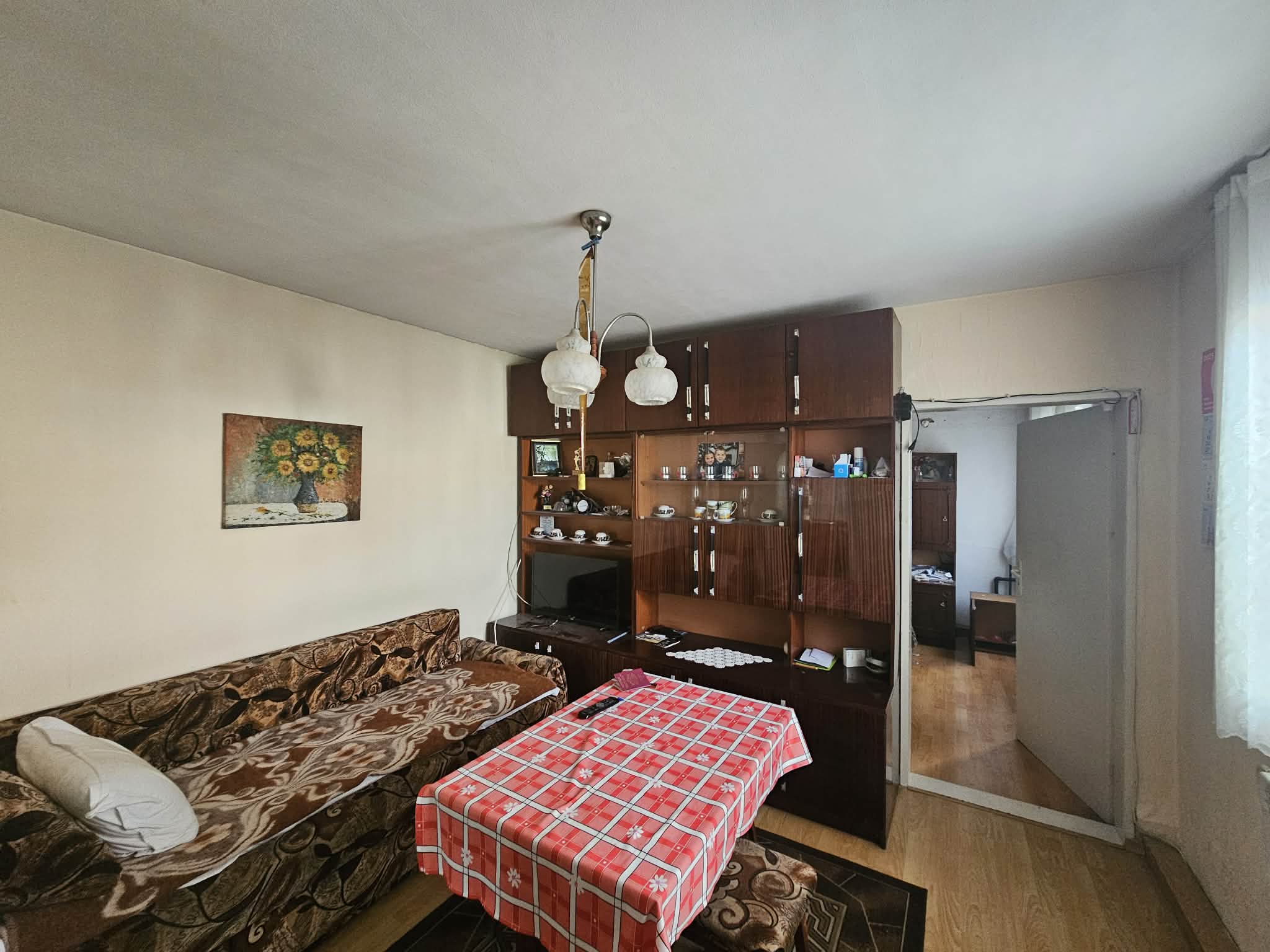 С външно стълбище е осигурен достъп до жилищния етаж, който се състои от входно антре, коридор, всекидневна с кухня, родителска спалня, детска спалня и санитарен възел. Сменена дограма, изградена отоплителна система на дърва с котел и радиатори. Монтирани охранителна система, климатици, интернет, телевизия.