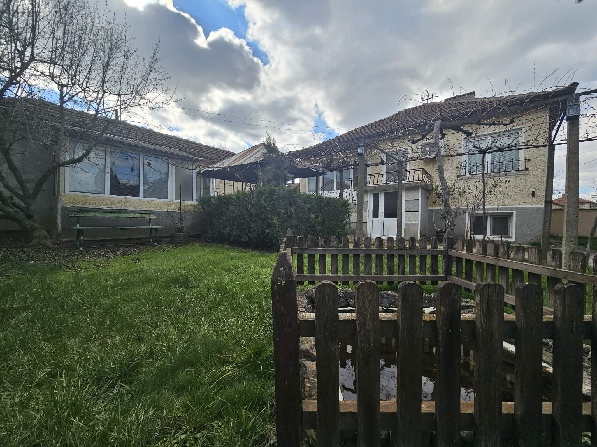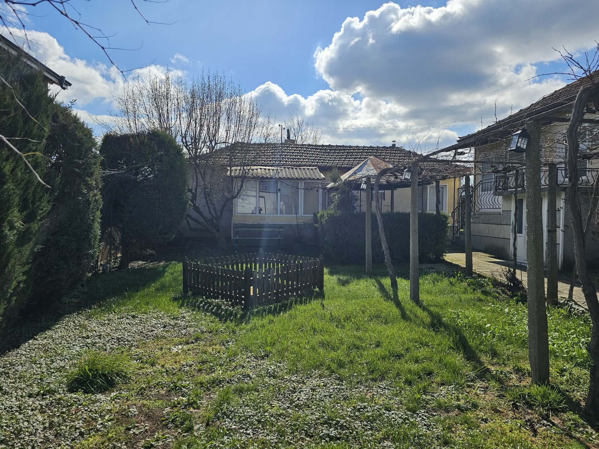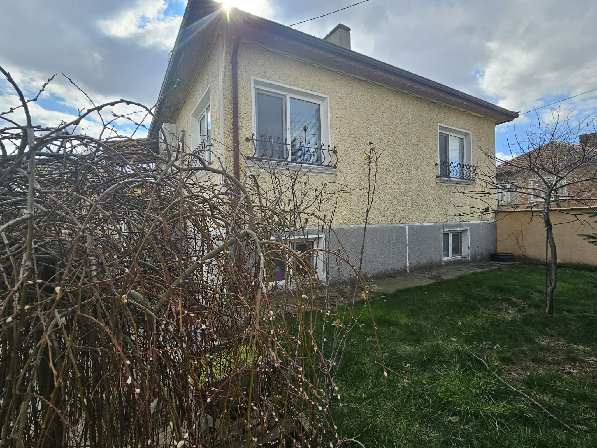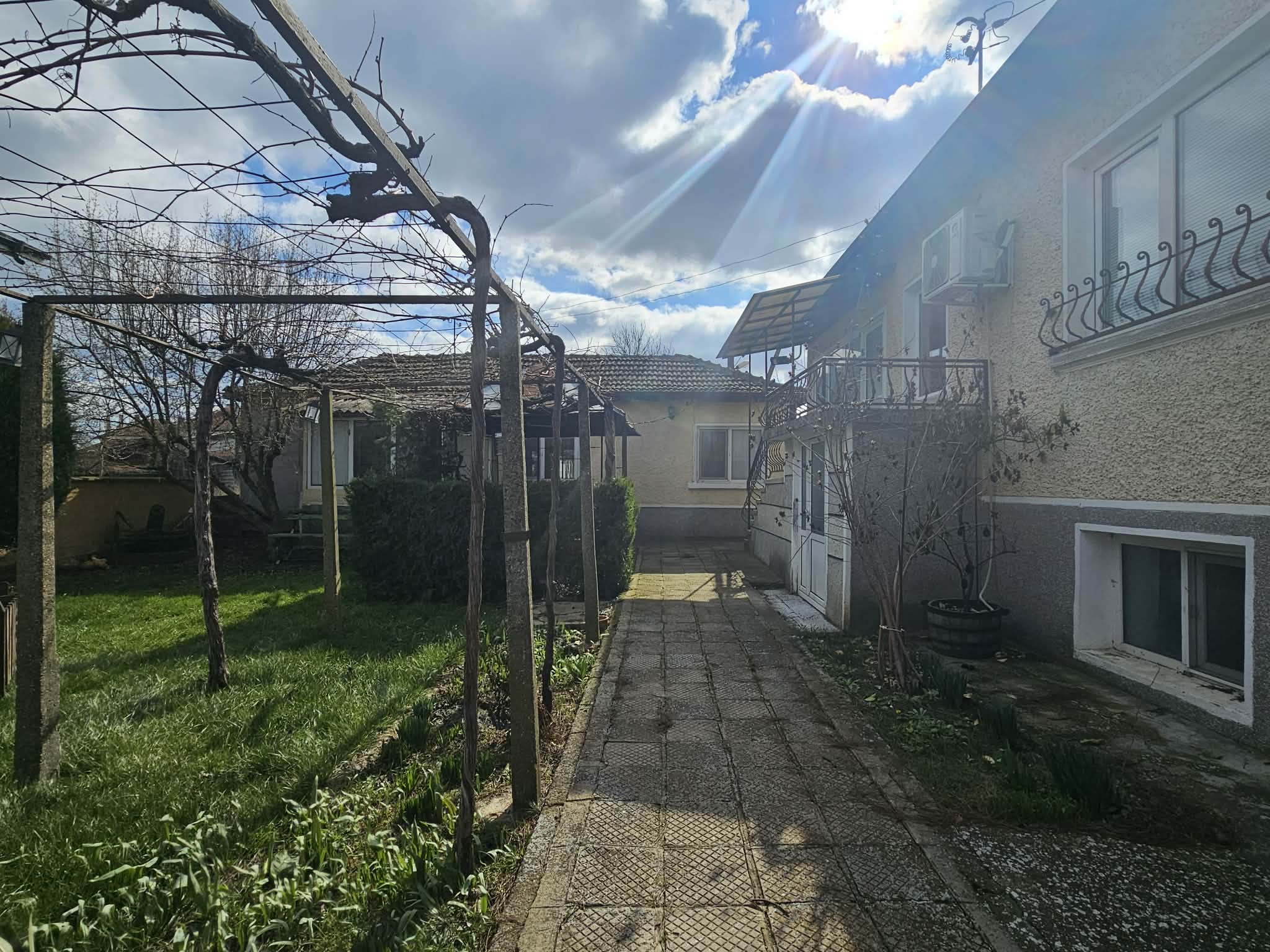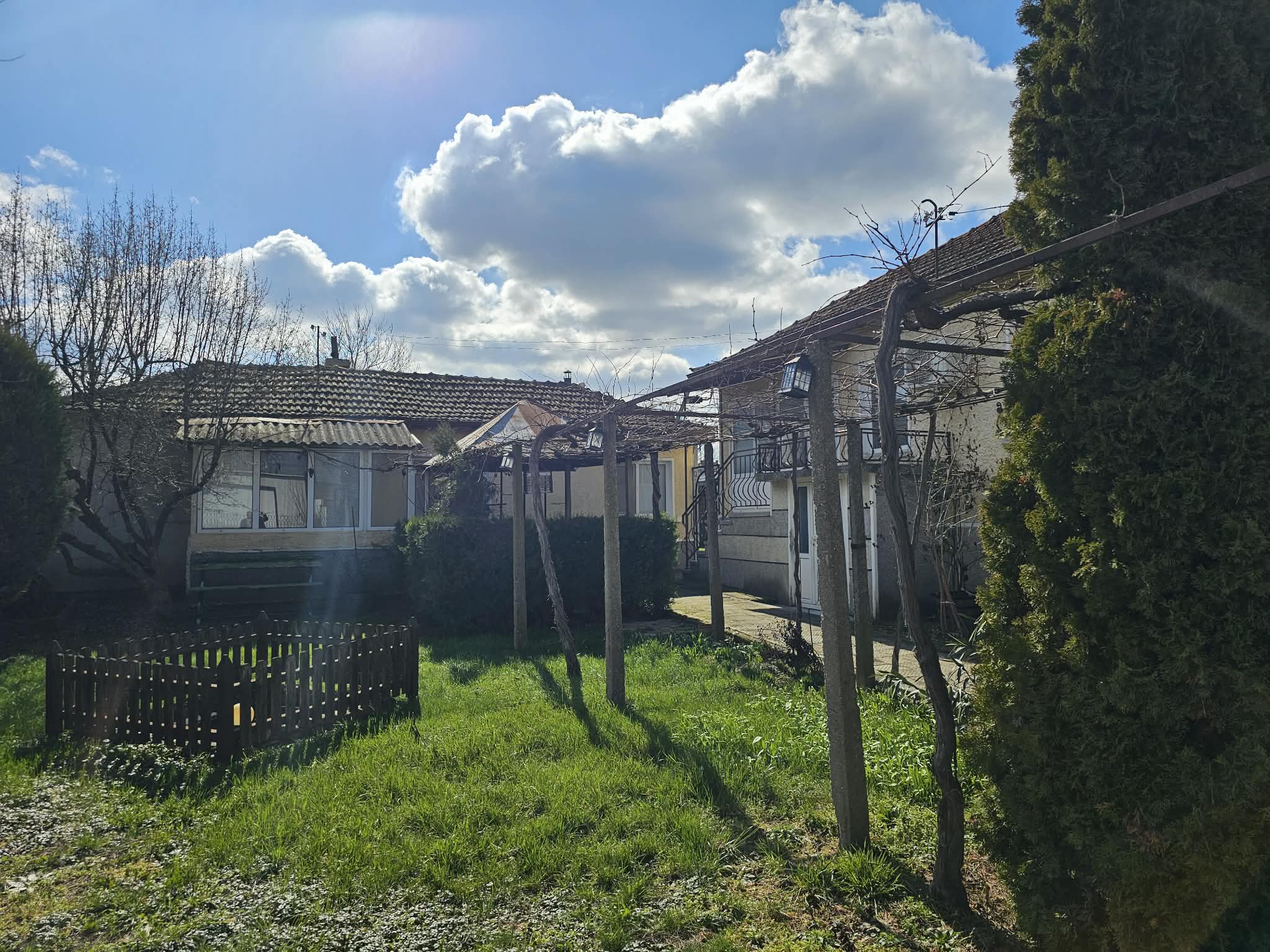 В задната част на парцела има засято лозе на телена конструкция, което се работи и е част от имота. В двора има изграден сондаж, хидрофор, капково напояване и т.н. Парцелът позволява обособяване на още места за паркиране и изграждане на малък басейн. БЕЗ КОМИСИОННА ОТ КУПУВАЧА!